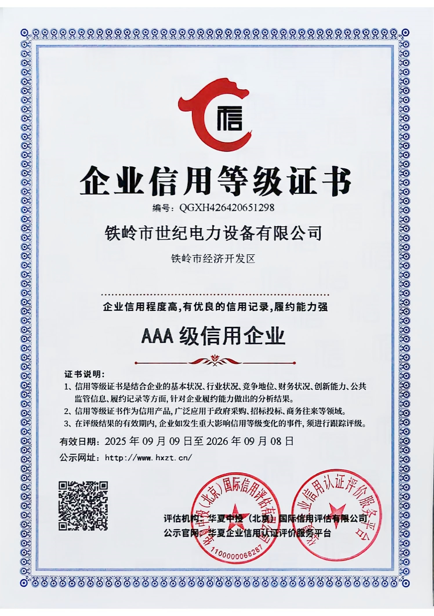 鐵嶺市世紀電力設備有限公司是集科研開發、生產制造、用戶服務于一體的國家高新技術企業,始建于1999年,位于鐵嶺經濟開發區,占地面積5萬余平方米,建筑面積2萬余平方米。主要從事國家電網配套戶外高低壓隔離開關、電力電纜、變壓器成套裝置、高低壓開關柜、箱式變電站、絕緣子等產品的研發、生產和銷售。公司現有國家發明專利6項、實用新型專利9項,公司通過了ISO9001國際質量管理體系認證、ISO14001環境管理體系認證和ISO 45001職業健康安全體系認證。